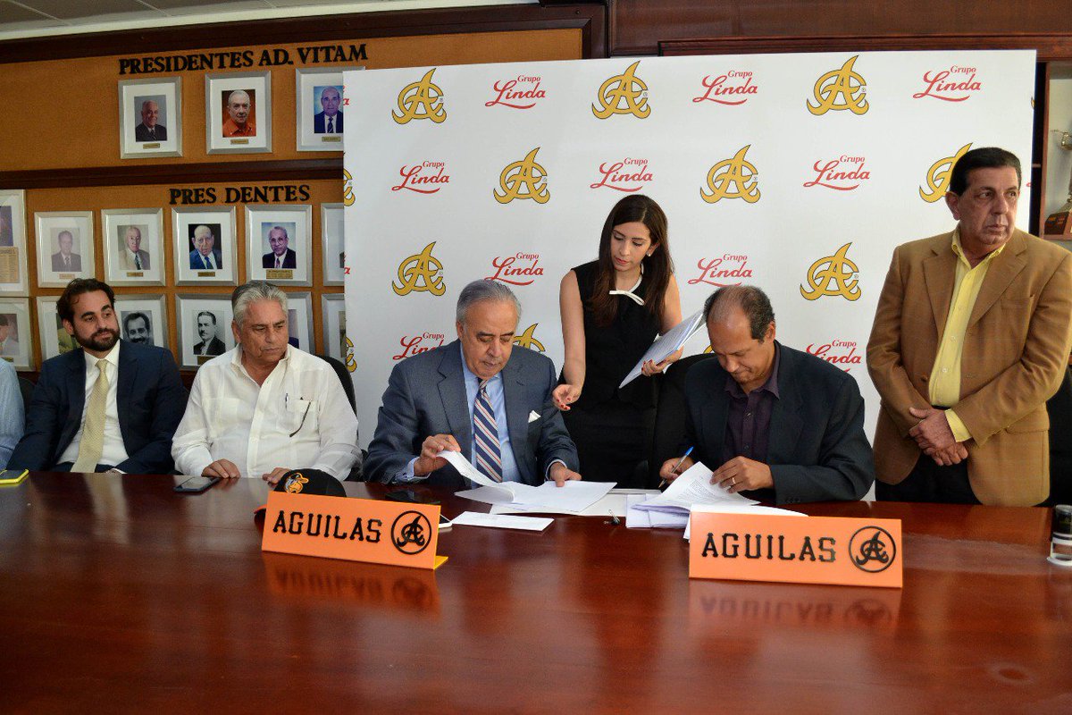 SANTIAGO. - Las Águilas Cibaeñas y el Grupo Linda firmaron un acuerdo de comercialización por tres años, en un acto celebrado en los salones principales del de su asiento social en el estadio Cibao, al que asistieron directivos de los Campeones de la pelota criolla y ejecutivos de la empresa contratante.